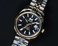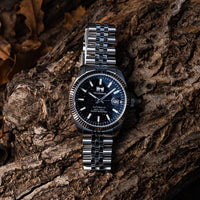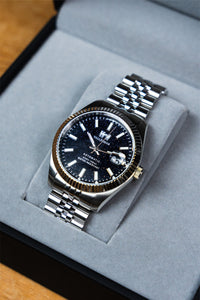 La lunetta zigrinata bicolore e il bracciale jubilee in acciaio inossidabile creano un’armonia perfetta tra eleganza classica e personalità moderna, rendendo questo modello ideale sia con un outfit formale che con un look più casual ma curato.